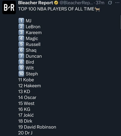 Βλέπεις πως τίποτα νέο δεν κινείται πέραν από κάτι δάχτυλα και κωλαράκια στον Καφενέ, οπότε σου κινεί την περιέργεια η ψηφοφορία του Bleacher Report για τον καλύτερο ever στην αντίπερα όχθη του Ατλαντικού και πατάς το μημενογά το κλικ για να δεις ποιός είναι πρώτος και τι ψηφίστηκε από τα ΑΜ ανά τον κόσμο.