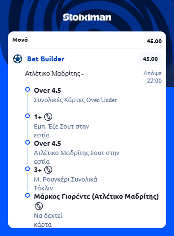 Χθες παραλίγο να ρεφάρουμε, αλλά δυστυχώς φιλαράκια μου χάθηκε για λίγο και σήμερα είπαμε να ξαναπροσπαθήσουμε, αλλά αυτή τη φορά με πιο χυν και ψαγμένες επιλογές από το Wanda Metropolitano και την ταυρομαχία των Ροχιμπλάνκος με την αρμάδα των Κανονιέρηδων. Ξεκίνημα με τις κάρτες του αγώνα, που πιστεύουμε πως ο Ολλανδός Μακέλι δεν θα χαριστεί σε κανέναν και αν αρχίσει να βγάζει από νωρίς ίσως βγει άνετα. Μέσα σε αυτές τις 5+ κάρτες που ζητάμε, προφανώς βάλαμε τον Μάρκος Γιορέντε, που θα έχει να αντιμετωπίσει τον Έζε. Εδώ δεν χρειάζεται να πούμε πολλά, καθώς ο Ισπανός αμυντικός αντιγράφει τακτικές γνωστού μπακ της πιο επιτυχημένης ομάδας της Μαδρίτης και ευκόλως κιτρινίζεται. Έτσι κόβει τον αέρα του Άγγλου εξτρέμ, που πλέον είναι βασικό γρανάζι στην αρμάδα του Αρτέτα και αναντικατάστατο.