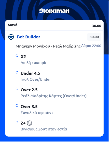 Μεγάλη αναμέτρηση για τη φάση των προημιτελικών στο Τσου Λου και δεν γινόταν να μην φτιάξουμε ένα χυν bet builder για την «ταυρομαχία» στο Μόναχο, με την Μπάγερν να υποδέχεται τη Ρεάλ Μαδρίτης.