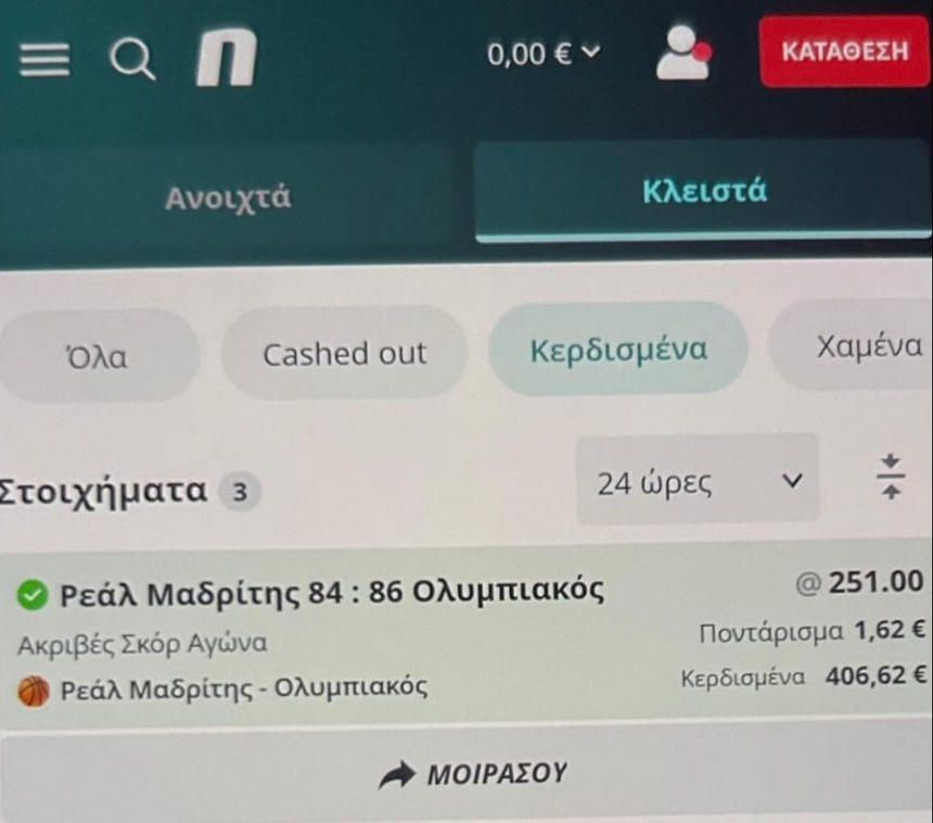 Κατάφερε να προβλέψει το ακριβές σκορ της αναμέτρησης ανάμεσα στη Ρεάλ Μαδρίτης και τον Ολυμπιακό (84-86), να ρίξει τιμιότατα 162 λεπτά του ευρώ, ολογράφως 1.62 σε απόδοση 251 (!) και να πάρει πίσω για να τα χρησιμοποιήσει για την ευχαρίστησή του 406.62 ευρώ.
