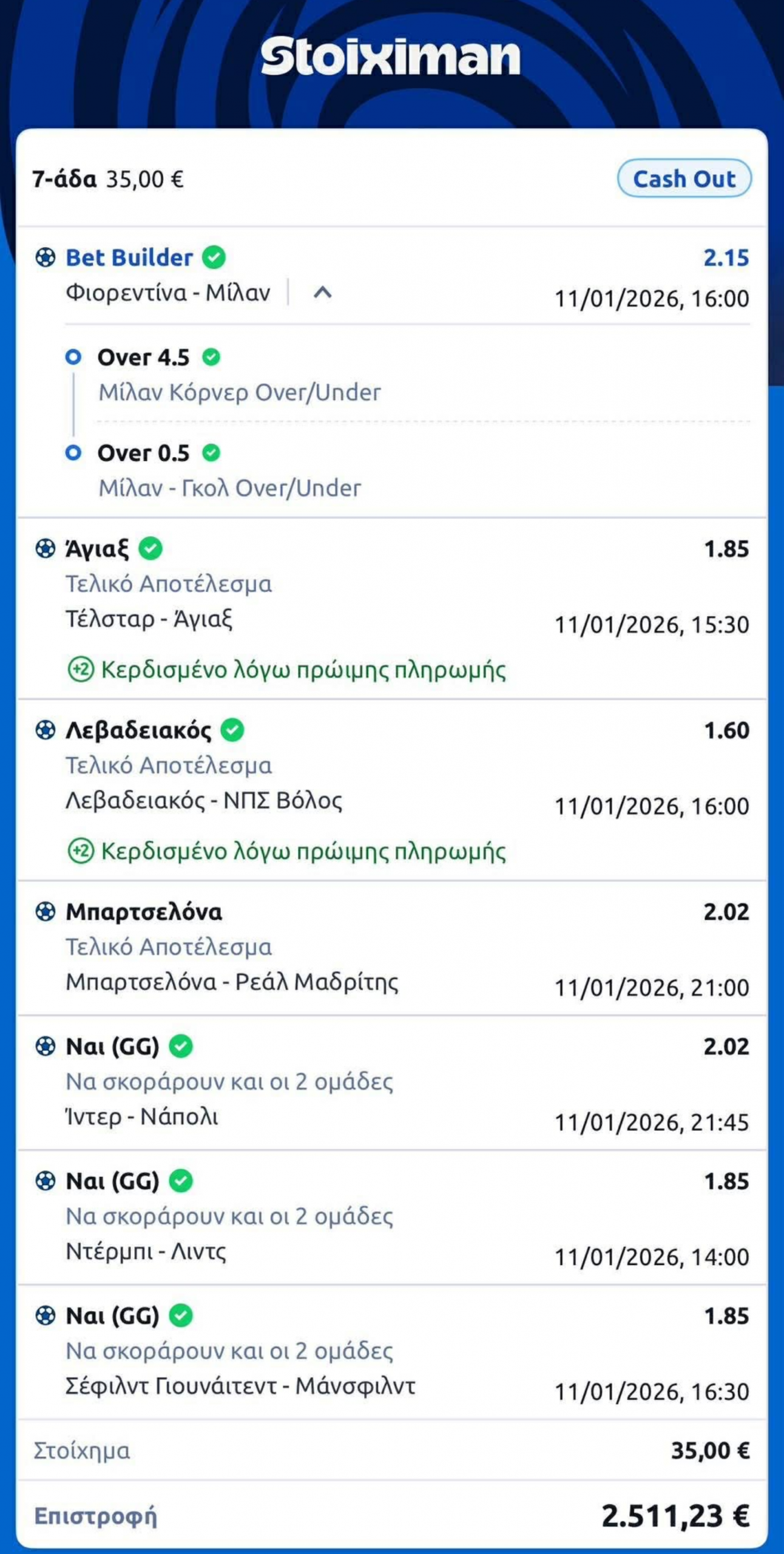 Ο παίκτης μας δεν φοβήθηκε να βάλει στο ίδιο δελτίο, κλάσικο, Μίλαν, την Ίντερ μεταξύ λίγο-πολύ προβλέψιμων αποτελεσμάτων, όπως ο άσος του Λεβαδειακού και τα αγγλικά GG.