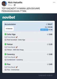 Χωρίς να παρέχονται οι απαραίτητες πληροφορίες μπορούμε εύκολα να καταλήξουμε στο συμπέρασμα πως ο χάστης μας τα έκανε πάνω του καθώς μέχρι το 75′ δεν είχε μπει γκολ σε μόλις 1 από τις 4 αναμετρήσεις που κυνηγούσε, επομένως αποφάσισε να κασάρει και να ρίξει τα ψίχουλα που του έδιναν για ένα στοίχημα που είχε μεγάλες προοπτικές σε άλλο δελτίο.