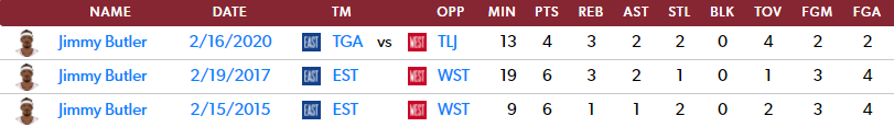O Jimmy Butler έχει παίξει σε 3 all star games. Σε κανένα απ’ τα 3 δεν έπαιξε πάνω από 20 λεπτά, σε κανένα δεν πήρε πάνω από 4 προσπάθειες και σε κανένα δεν έβαλε πάνω από 6 πόντους. Δεν είναι μυστικό ότι ο Jimmy σιχαίνεται τα all star games. Έχει δηλώσει στο παρελθόν πως δε θέλει να βρίσκεται εκεί και κυριολεκτικά έχει μηδενική ενέργεια όταν παίζει. Είναι ένας winning player που δεν τον ενδιαφέρουν τα φρου φρου και αρώματα. Θεωρώ πως θα μείνει στο παρκέ για 13-15 λεπτά και θα τελειώσει με 4-6 πόντους.