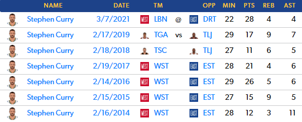 Δεν ξέρω τι κάνουν με αυτή τη γραμμή πραγματικά. Ο Curry έχει παίξει σε 7 All star games απ’ το 2014 και μετά με μέσο όρο 28′ συμμετοχής. Σ’ αυτά τα 7 ASG έχει 7/7 Over με 6.43 apg. Σε ένα παιχνίδι γεμάτο highlights και μηδενική άμυνα, ο Curry χρειάζεται να βρει 4 πάσες που θα καταλήξουν στο καλάθι.