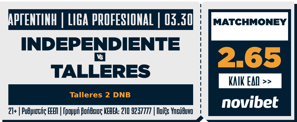 Τα σετ είναι ξεκάθαρο πως αδικούν την Ταγέρες. Φαβορί δεν είναι στο «Μποτσίνι», δεν θα μπορούσε να συμβαίνει κάτι τέτοιο, όμως το να πληρώνει κοντά στο 4,00 είναι λίγο υπερβολικό. Η Ιντεπεντιέντε δεν είναι καλά, πέρα από τα εξωαγωνιστικά προβλήματα που χαλούν το μυαλό όλων έχει και αγωνιστικά θέματα, έφυγαν ή φεύγουν παίκτες με συμμετοχή στην πρώτη ομάδα και δεν υπάρχουν αντικαταστάτες. Η «Τε» αν πιάσει ίδια απόδοση με το προηγούμενο, δεν θα πάρει απλώς αποτέλεσμα, θα κερδίσει κιόλας. Στο 2,65 το 2 DNB αξίζει το ρίσκο.