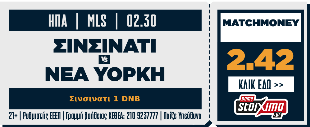 Το Σινσινάτι είναι σούπερ σε σχέση με πέρυσι, μετράει ήδη 7 νίκες με στο 1-0 με το Ορλάντο έκανε διπλάσιες τελικές (xGoals 1,20-0,30). Από την άλλη το Νιουγιόρκι, είναι με υπηρεσιακό προπονητή και έρχεται από ήττα στο κύπελλο και υποτονική εμφάνιση και νέα ήττα στο πρωτάθλημα από την Φιλαδέλφεια με 2-1 (xGoals 1,90-1,30). Μomentum και αποδόσεις, οδηγούν στον άσσο DNB του 2,42.