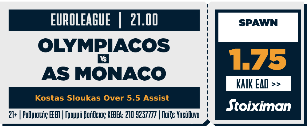Το σημερινό μας σημείο από τον αγώνα αυτόν, είναι οι Assist του Κώστα Σλουκα με line 5.5 και απόδοση 1.75 στην Stoiximan.