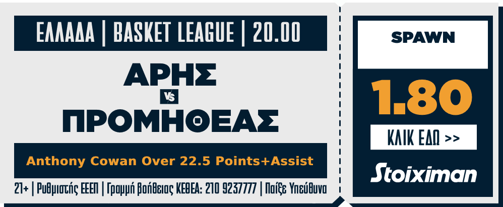 Το σημερινό μας σημείο από τον αγώνα αυτόν είναι ο συνδυασμός Points+Assist του Anthony Cowan με line 22.5 και απόδοση 1.80 στην Stoiximan.