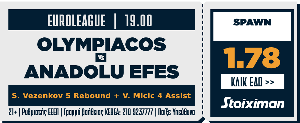 Το σημείο μας από τον αγώνα σήμερα, είναι ένας συνδυασμός Betbuilder, 5 Rebound του Sasha Vezenkov και 4 Assist του Vasilije Micic σε απόδοση 1.78 στην Stoiximan.