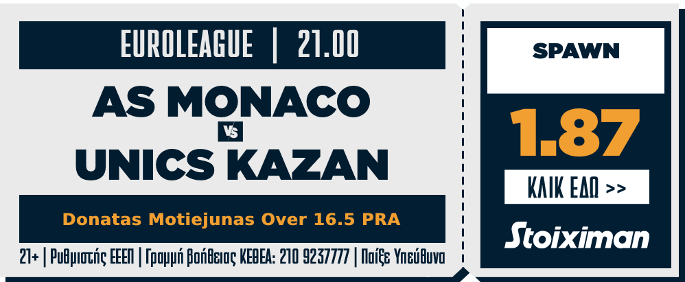 Καλημέρα, μετά το εύκολο ταμείο του Sasha Vezenkov στην τρίτη περίοδο στον τελικό Κυπέλλου Ελλάδος, σήμερα μεταφερόμαστε στην Γαλλία και συγκεκριμένα στο Πριγκιπάτο του Μονακό για τον αγώνα της ομώνυμης ομάδας απέναντι στην Unics Kazan για την Euroleague.
