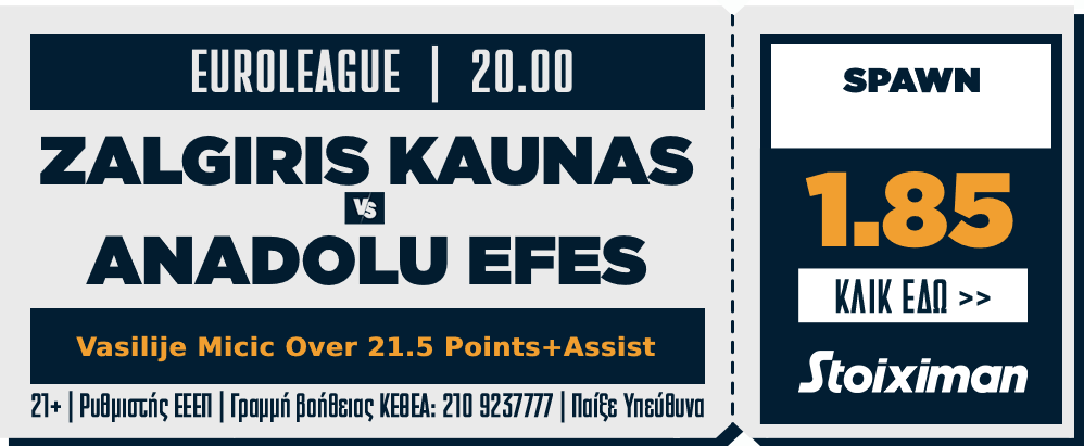 Το σημερινό μας σημείο λοιπόν από τον αγώνα αυτόν, είναι ο συνδυασμός Points+Assist του Vasilije Micic με line 21.5 και απόδοση 1.85 στην Stoiximan.
