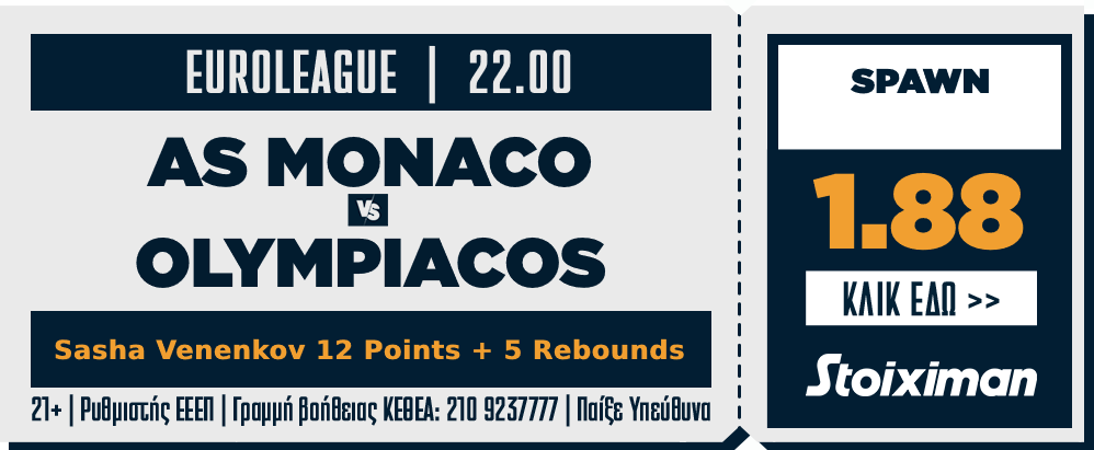 Το σημείο μας από τον αγώνα αυτό, είναι ένας συνδυασμός MatchCombo, 12 Points + 5 Rebounds του Sasha Vezenkov με απόδοση 1.88 στην Stoiximan.