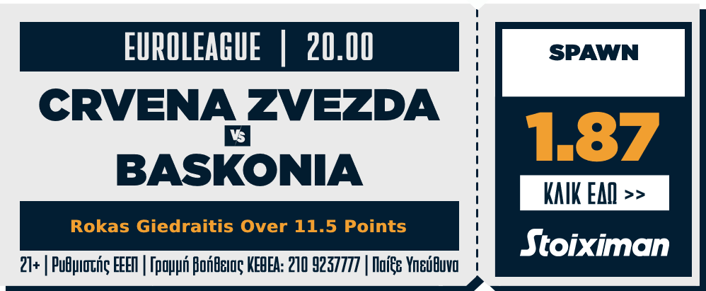 Στην προηγούμενη αναμέτρηση μεταξύ των δύο ομάδων στην Ισπανία, ο Giedraitis κατέγραψε 21 πόντους σε 30 λεπτά. Γενικά, στους τελευταίους 10 αγώνες της Baskonia σε Euroleague αλλά και ACB, το Over του line έχει επιβεβαιωθεί σε 8,απέναντι σε Barcelona, Maccabi Tel Aviv, Panathinaiko, Zenit, Olympiacos, Armani Milano, Fuenlabrada και Betis . ( 20, 15, 12, 14, 12, 12, 13, 18 ).