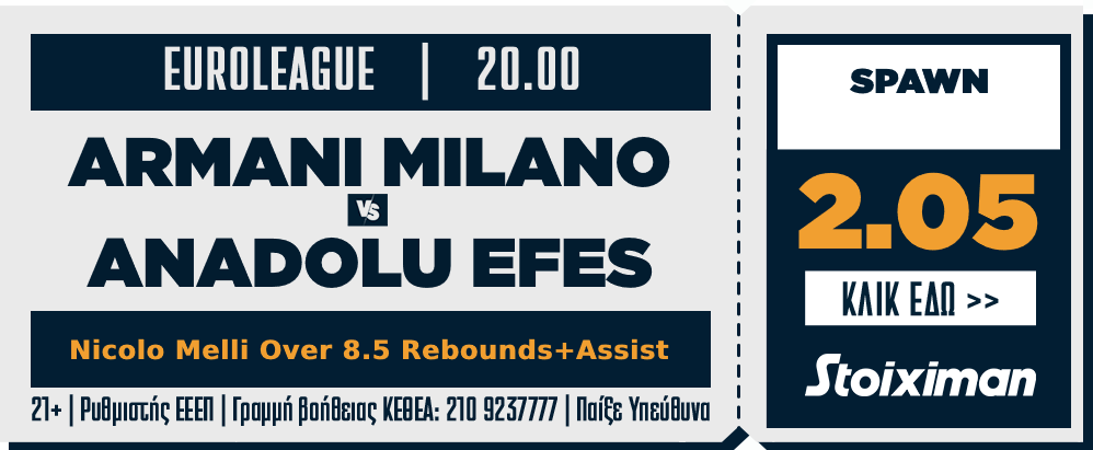 Το σημερινό μας σημείο από τον αγώνα αυτόν, είναι ο συνδυασμός Rebounds+Assist του Nicolo Melli με line 8.5 και απόδοση 2.05 στην Stoiximan.