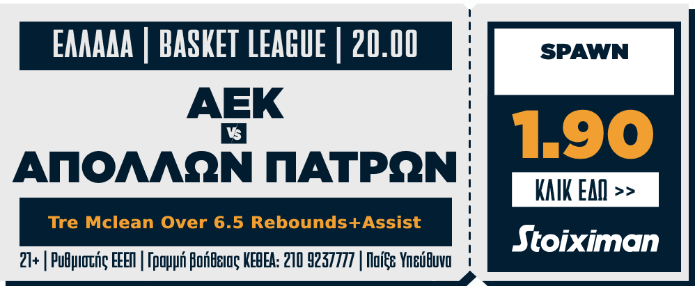 Καλησπέρα, μετά το ταμείο του Marvin Jones που τελείωσε τον αγώνα με 20 Points και 7 Rebound, παίχτης που δεν μας απογοητεύει ποτέ,θα πάμε στο κλειστό γήπεδο των Άνω Λιοσίων για τον αγώνα της Αεκ με τον Απόλλων Πατρών για την Α1 Stoiximan Basket League !