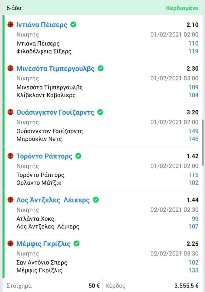 Στα υπόλοιπα ματσάκια που χρειάστηκαν κι αυτά για την πληρωμή, παίζει το πιο δύσκολο σημείο να ήταν το 1.44 των Lakers οι οποίοι πηγαίναν σχεδόν σε όλο το ματς ως νέος Χρήστος Δάντης πόντο πόντο με τους Atlanta Hawks, φτάνοντας τελικά στη νίκη μόλις στο τελευταίο λεπτό…