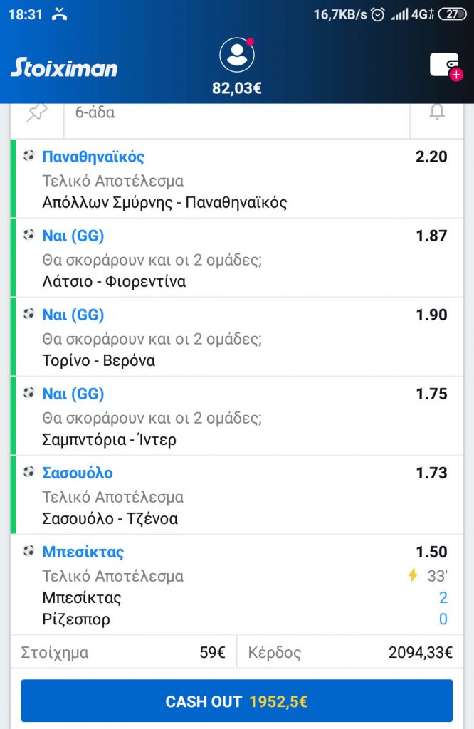 Βέβαια καλό θα είναι ο χαστοβουτηχτής μας να ανάψει και κανά κεράκι, αφού τα τρία ιταλικά πλην της Ίντερ, βγήκανε στο τελευταίο 10λεπτο, ενώ και το διπλό του Παναθηναϊκού ήθελε 2-3 αλλαγές σε σωβρακάκι μέχρι να κάτσει η μπίλια στο επιθυμητό για τον παίκτη αποτέλεσμα. Ο οποίος όμως επιβραβεύθηκε για την τιμιότητα του με το 60άρι που έσπρωξε κι όχι κάτι δύευρα και τρίευρα που βλέπουμε κατά καιρούς στο Πρακτορείο να ρουφάν για πλάκα, μισό ΕΣΠΑ για την δημιουργία ντελικατέσεν τυροπιτάδικου στο Παγκράτι.