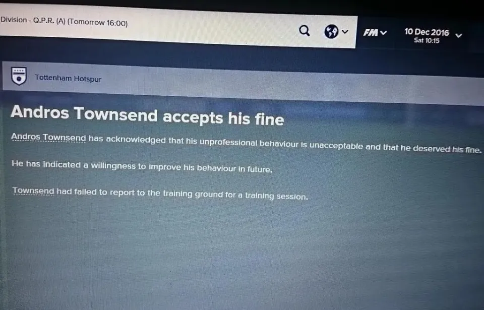 Η ιστορία λοιπόν, έχει κάπως έτσι. Ένας νορμάλ τύπος, που έπαιζε το Football Manager του, θεώρησε για κάποιον λόγο να ανεβάσει φωτογραφία, όπου ο ψηφιακός Townsend εφαγε πρόστιμο επειδή έχασε την προπόνηση ξανά λέμε στο παιχνίδι πάντα.
