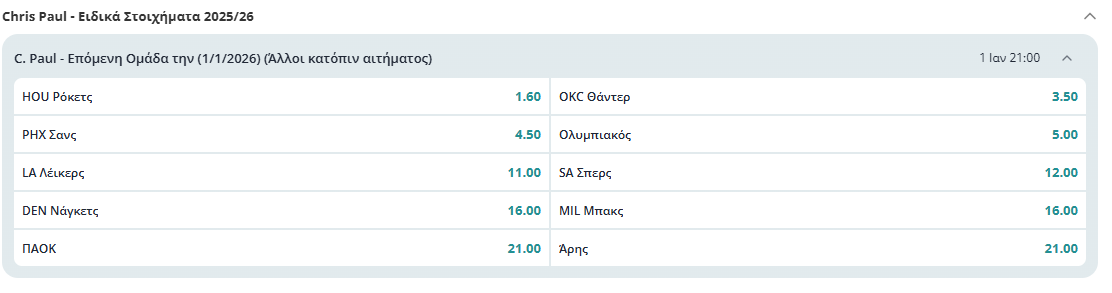 Στη Novibet πάντως δεν το έχουν πάρει καθόλου αψήφιστα, αφού το να πάει ο Κρις Πολ στον Θρύλο πληρώνει στις 5.00 μονάδες.