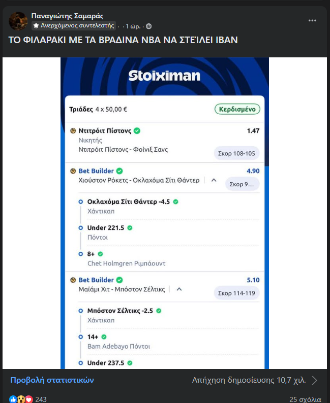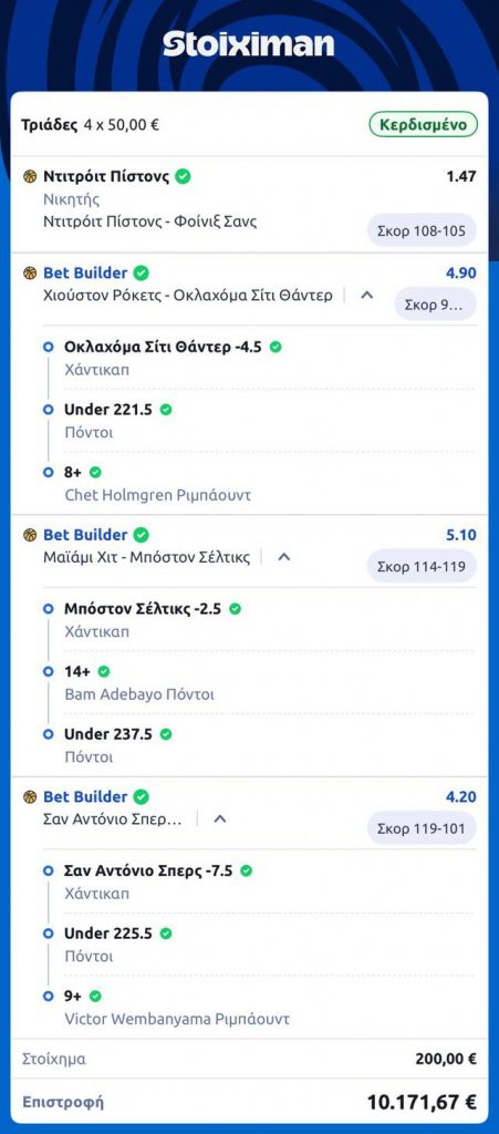 Ρίχνοντας το διόλου ευκαταφρόνητο ποσό των 200 ευρώ πίστεψε στα λεγόμενα του Μάστερ,πείραξε λίγο τα σημεία προς τα πάνω και έκανε μία αντρική/κωλόφαρδη επιλογή παίζοντας under 225.5 αντί για Over τους Σπερς με τους Μπακς και 10 χήνες πλέον γεμίζουν τον λογαριασμό του.