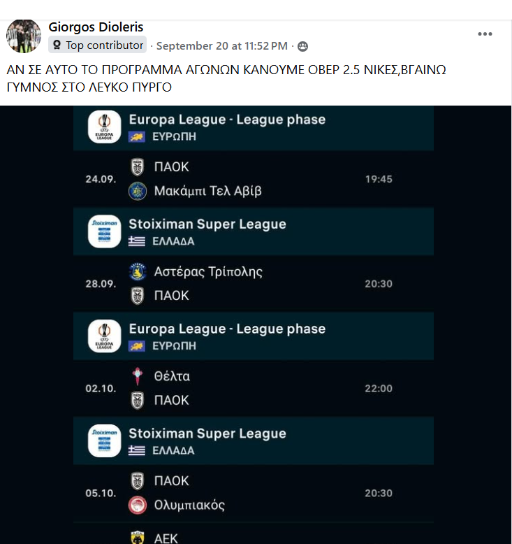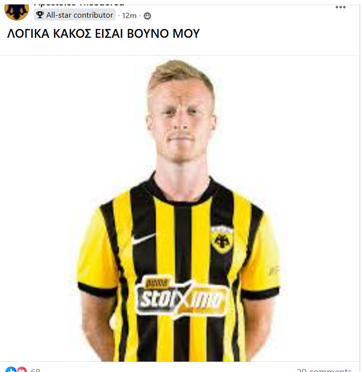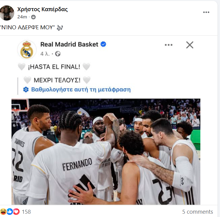 Και εκεί που νομίζαμε πως στην χειρότερη θα είχαμε μια ελληνική ομάδα να δούμε τέτοια σχόλια (μάλλον ΠΑΟΚ λόγω αντιπάλου), ήρθε και η ΑΕΚ να χάνει από το θηρίο που έρχεται στο όνομα Τσέλιε, αλλά και την ήττα του Ολυμπιακού στην Ισπανία με 89-77 από την Ρεάλ Μαδρίτη… ΚΟΝΙΟ ΚΑΡΑΧΟ ΠΟΥΤΑ ΚΕ ΛΑ ΜΑΡΓΙΟΣ