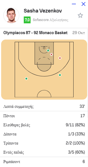 Σε 33 λεπτά συμμετοχής ο Σάσα επιχείρησε 5 σουτ εντός πεδιάς